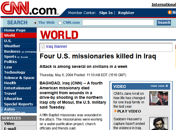 Karen.WatsonKaren Watson went to Iraq as a missionary serving in humanitarian relief.  Before leaving her church in Bakersfield, CA, she left a letter that was to be read in the event of her death.  Karen was 38 years old when she was killed on May 4, 2004 when militants sprayed her vehicle with AK-47 gunfire.